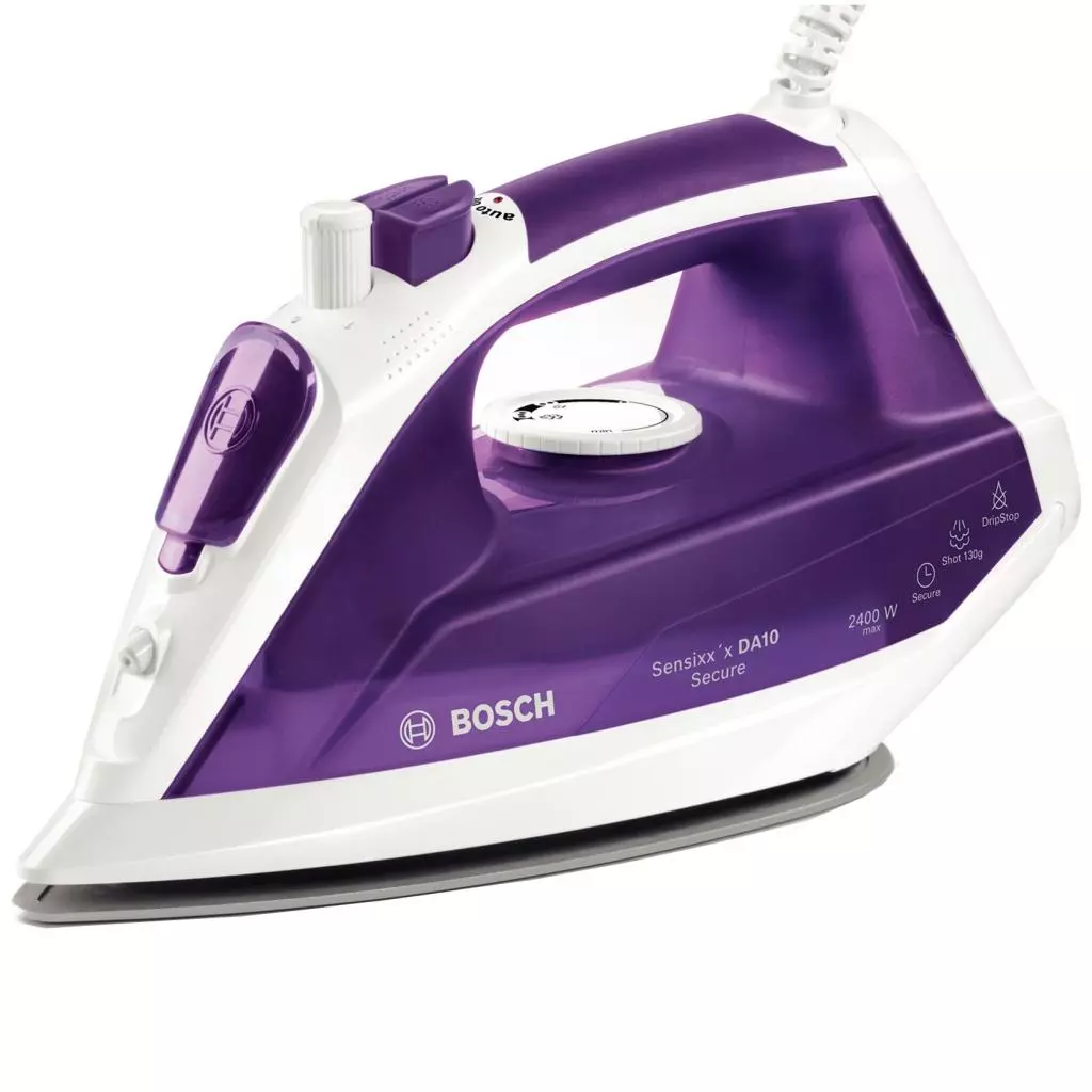 Тип утюга - утюг с подачей пара, Мощность - 2400 Вт, материал подошвы - керамика, резервуар для воды - 300 мл, автоматическое отключение, система защиты от накипи, противокапельная система, скорость парового удара - 130 г/мин, Цвет - белый, фиолетовый