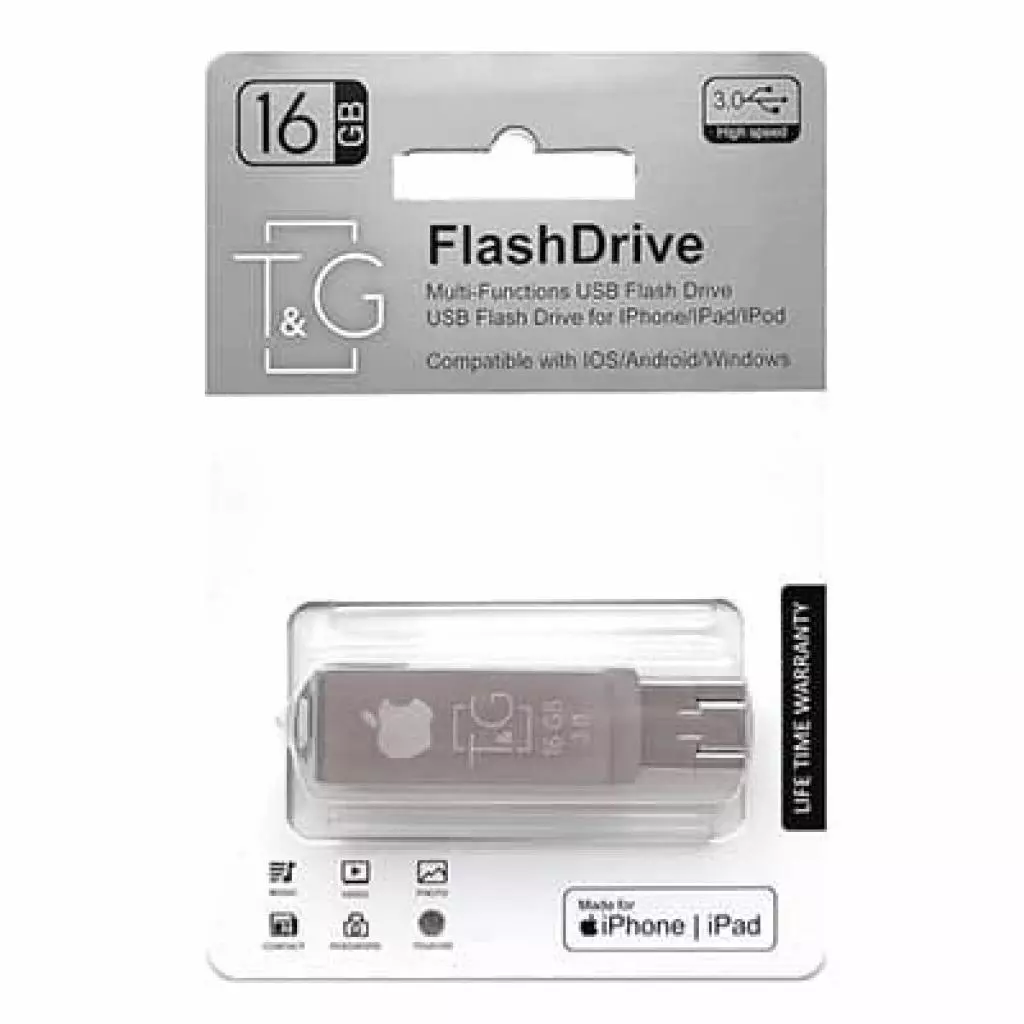 Флеш-накопитель T & G 004 Metal Series 16GB USB 3.0 Lightning (TG004IOS-16G3) - привлекательный вариант, когда вам необходимо перенести данные между различными компьютерами или иметь при себе несколько важных файлов. Ведь не всегда есть возможность взять с собой внешний жесткий диск или подключиться к «облаку». А компактный и объемный по размеру памяти флэш-накопитель оптимально носить с собой, сохранив всю необходимую информацию.